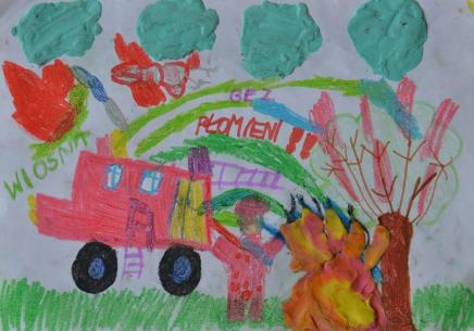 Opis zdjęcia: Kolorowy rysunek dziecka przedstawiający wóz strażacki podczas akcji gaśniczej i napis "Wiosna bez płomieni" - jedna z prac konkursowych z lat ubiegłych. Fot. P. Mrowiński