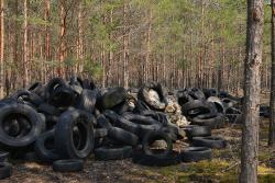 W dużej stercie widoczne są przede wszystkim zużyte opony różnego typu: dużych samochodów ciężarowych, samochodów osobowych oraz mniejszych pojazdów m.in. urzadzeń rolniczych.