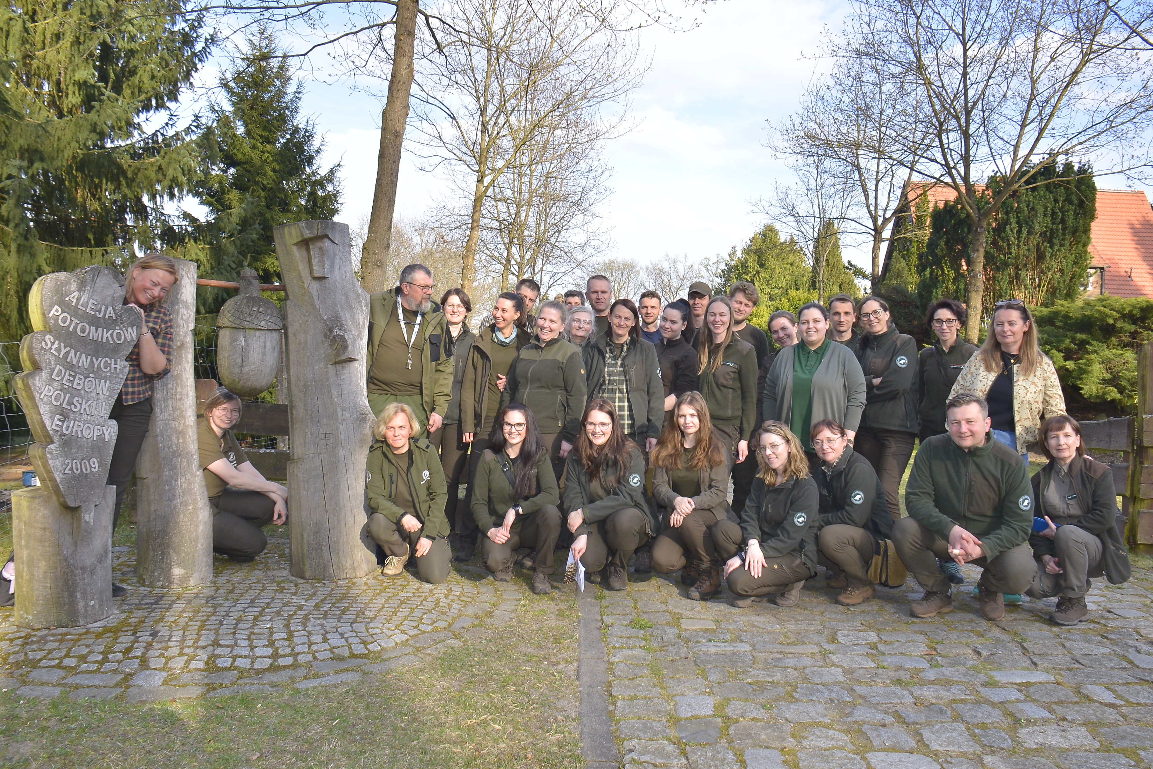 Fot. Grupa toruńskich leśników pozuje do zdjęcia na terenie OEPL w Jeziorach Wysokich. Po lewej stronie stoi drewniana rzeźba ze stylizowanym liściem dębu i wiszącym żołędziem. Na liściu widnieje napis: "Aleja potomków słynnych dębów Polski i Europy. 2009"