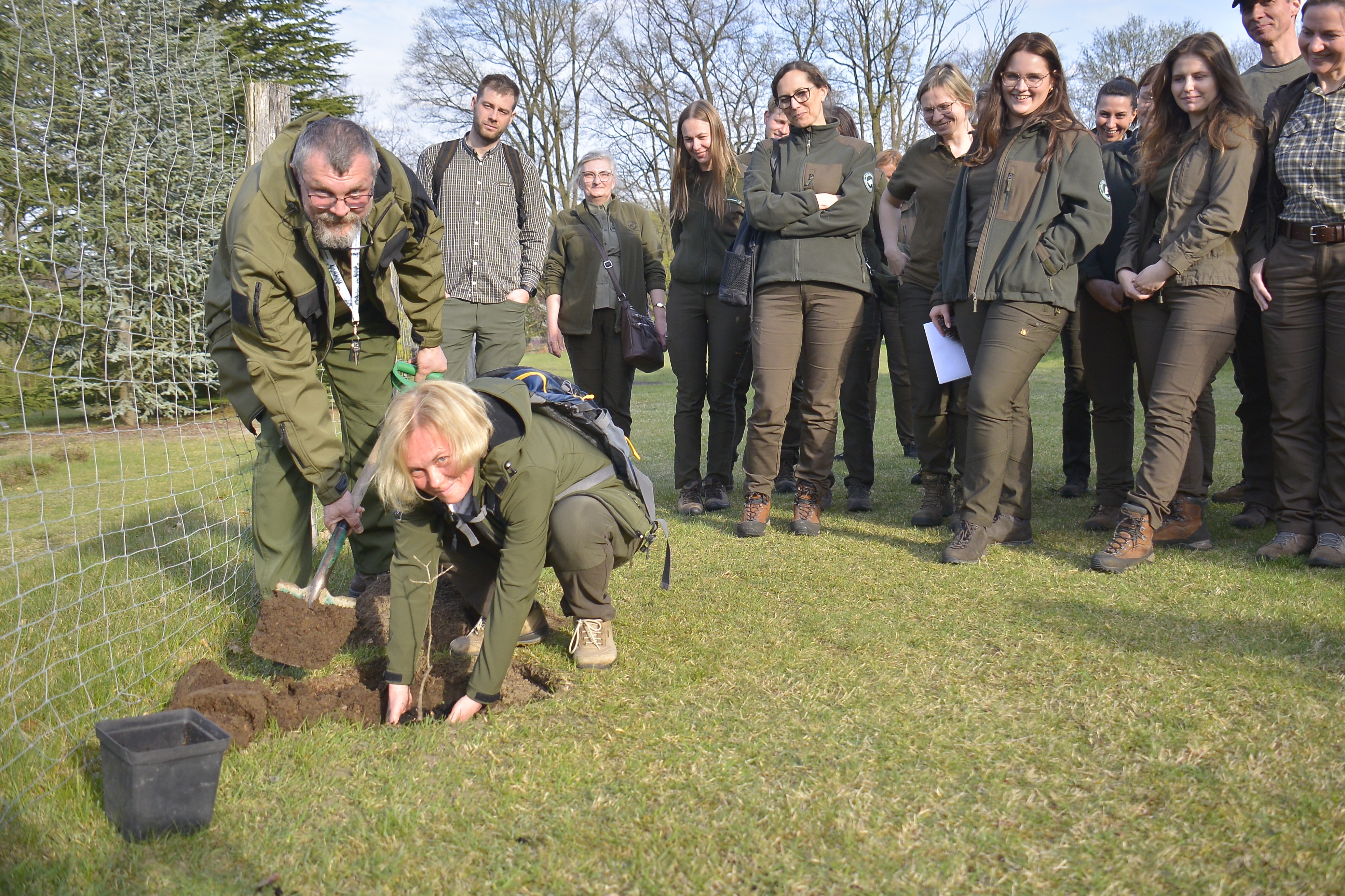 Fot. Na pierwszym planie leśniczka i leśnik sadzą wspólnie potomka "Dębu Wyczółkowskiego". W tle stoją leśnicy w terenowych ubraniach. Autor zdjęcia: Paweł Mrowiński