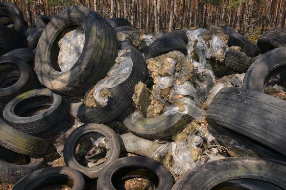 W dużej stercie widoczne są przede wszystkim zużyte opony różnego typu: dużych samochodów ciężarowych, samochodów osobowych oraz mniejszych pojazdów m.in. urzadzeń rolniczych.