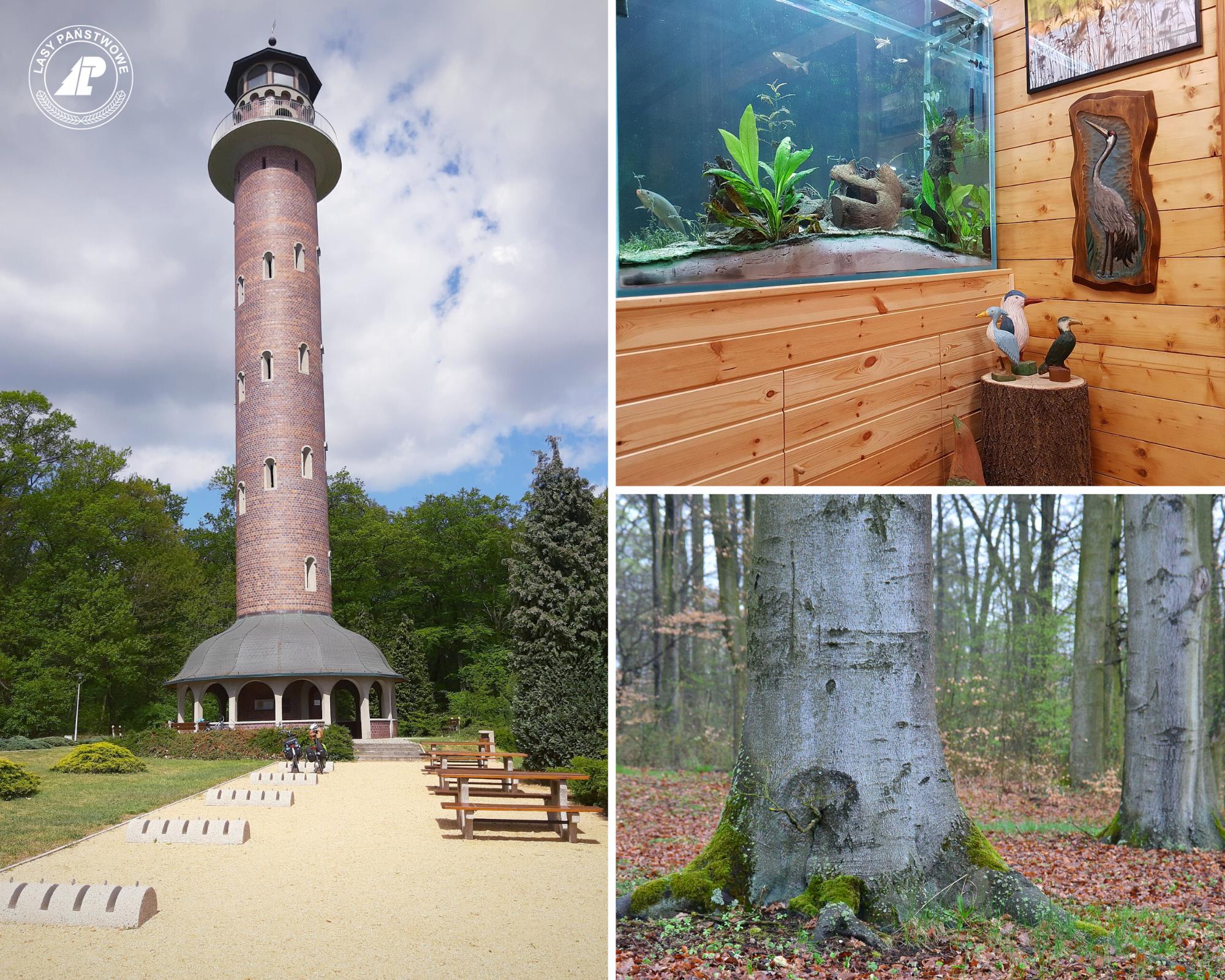 Opis zdjęcia głównego: infografika złożona z trzech zdjęć: po lewej stronie znajduje się zdjęcie z murowaną wieżą przeciwpożarowo-widokową i białym logo Lasów Państwowych w górnym lewym rogu, po prawej stronie, na górnym zdjęciu znajduje się fragment jednej z sal wystawowych z widocznym akwarium i drewnianą boazerią i kolorowymi rzeźbami ptaków; na dolnym zdjęciu widoczny jest fragment liściastego lasu - widoczne są grube, szare, pnie buków. Autor zdjęć: Paweł Mrowiński